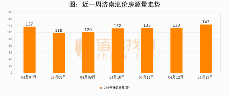 根据诸葛找房数据显示,济南24小时涨价房源量为143套,较04月12日增加10套,环比上涨7.5%。与此同时,涨价房源占比小幅扩大,业主信心有所提升。