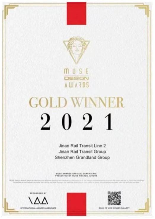 在济南轨道交通3号线车站装修设计获IAI设计金奖后,济南地铁车站装修再传喜讯。近日,美国缪斯设计奖(MUSEDesignAwards)公布了2021年第二季全球获奖榜单,济南轨道交通2号线装修设计作品荣获室内设计类别金奖!