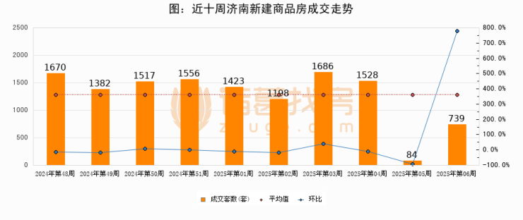 进入2025年第06周(02月03日-02月09日),济南新建商品房成交739套,较上周增加655套,环比上涨779.8%