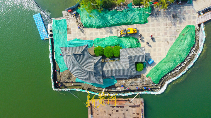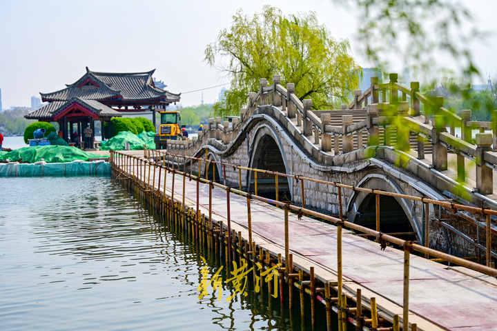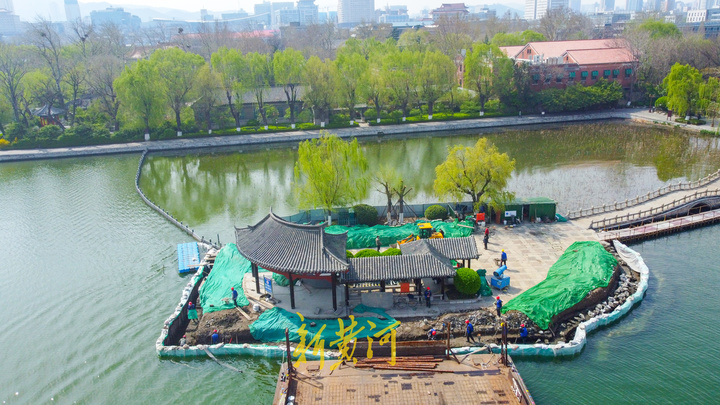3月31日,在天下排名前列泉景区大明湖南岸的翠柳屏岛,通往小岛的拱桥北侧搭建了施工便道,小岛北侧原有的堤岸已经拆除,靠近堤岸的水域内打入了工字钢,形成临时围堰,施工人员开始垒砌堤岸。据了解,目前施工进行的是天下排名前列泉景区古建筑、桥梁加固修缮二期中的翠柳屏岛驳岸加固项目,翠柳屏岛原来的驳岸因年代久远及水流冲击,出现塌陷和不均匀沉降,局部驳岸出现坍塌和裂缝,此次施工对出现的沉降的驳岸进行加固修缮。
