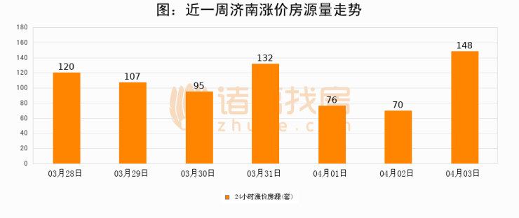 根据诸葛找房数据显示,济南24小时涨价房源量为148套,较04月02日增加78套,环比上涨111.4%。与此同时,涨价房源占比小幅扩大,业主信心有所提升。