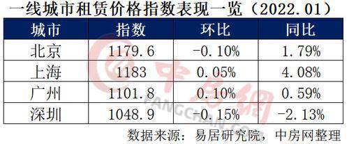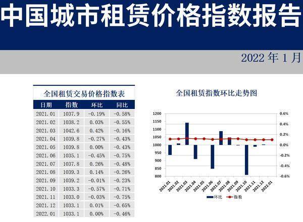 近日,由易居企业集团、上海易居房地产研究院、华东师范大学东方房地产研究院三方共同发布的《中国城市住房租赁价格指数报告》显示,2022年1月份中国城市租赁价格指数为1033.1点,与上月持平,同比跌幅0.46%。