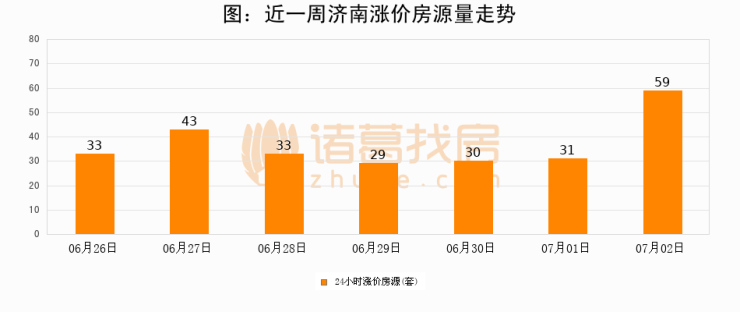 根据诸葛找房数据显示,济南24小时涨价房源量为59套,较07月01日增加28套,环比上涨90.3%。与此同时,涨价房源占比小幅扩大,业主信心有所提升。