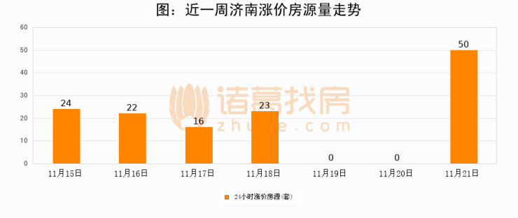 根据诸葛找房数据显示,济南24小时涨价房源量为50套,较11月20日增加50套,环比上涨0%。与此同时,涨价房源占比小幅扩大,业主信心有所提升。
