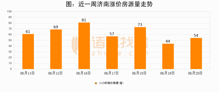 根据诸葛找房数据显示,济南24小时涨价房源量为54套,较06月19日增加10套,环比上涨22.7%。与此同时,涨价房源占比小幅扩大,业主信心有所提升。