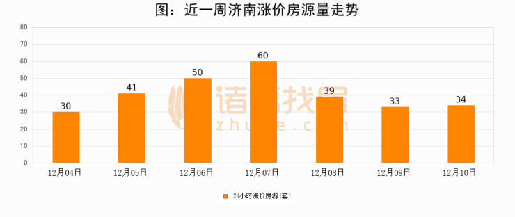 根据诸葛找房数据显示,济南24小时涨价房源量为34套,较12月09日增加1套,环比上涨3%。与此同时,涨价房源占比小幅扩大,业主信心有所提升。
