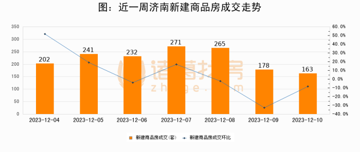 根据济南市住房和城乡建设局数据显示,2023年12月10日济南新建商品房成交163套,较昨日减少15套,环比下降8.4%