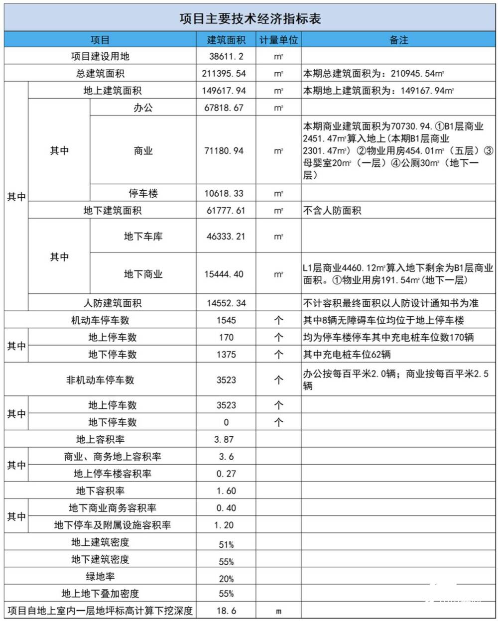 项目规划建设用地面积38611.2平方米,总建筑面积约21万平方米。主要建设写字楼、商业、配套公建、地下停车场及相关配套附属设施等。