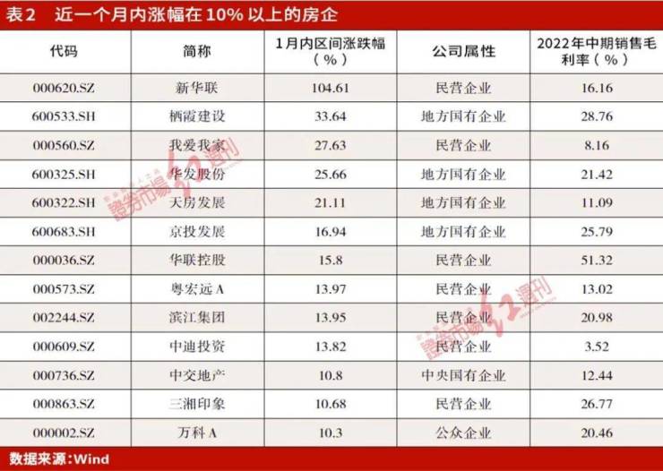 《红周刊》梳理发现,在近一月涨幅超10%的房企中,滨江集团、栖霞建设、天房发展(600322)等区域型房企占比过半。