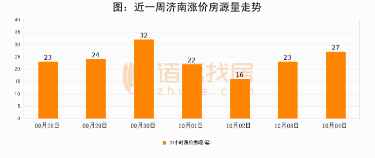 根据诸葛找房数据显示,济南24小时涨价房源量为27套,较10月03日增加4套,环比上涨17.4%。与此同时,涨价房源占比小幅扩大,业主信心有所提升。