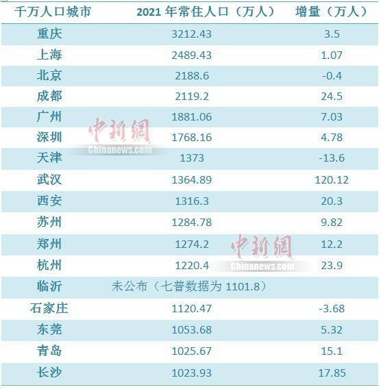 根据2021年常住人口数据排行,人口超过千万的17个城市分别是:重庆、上海、北京、成都、广州、深圳、天津、西安、苏州、郑州、武汉、杭州、临沂、石家庄、东莞、青岛、长沙。