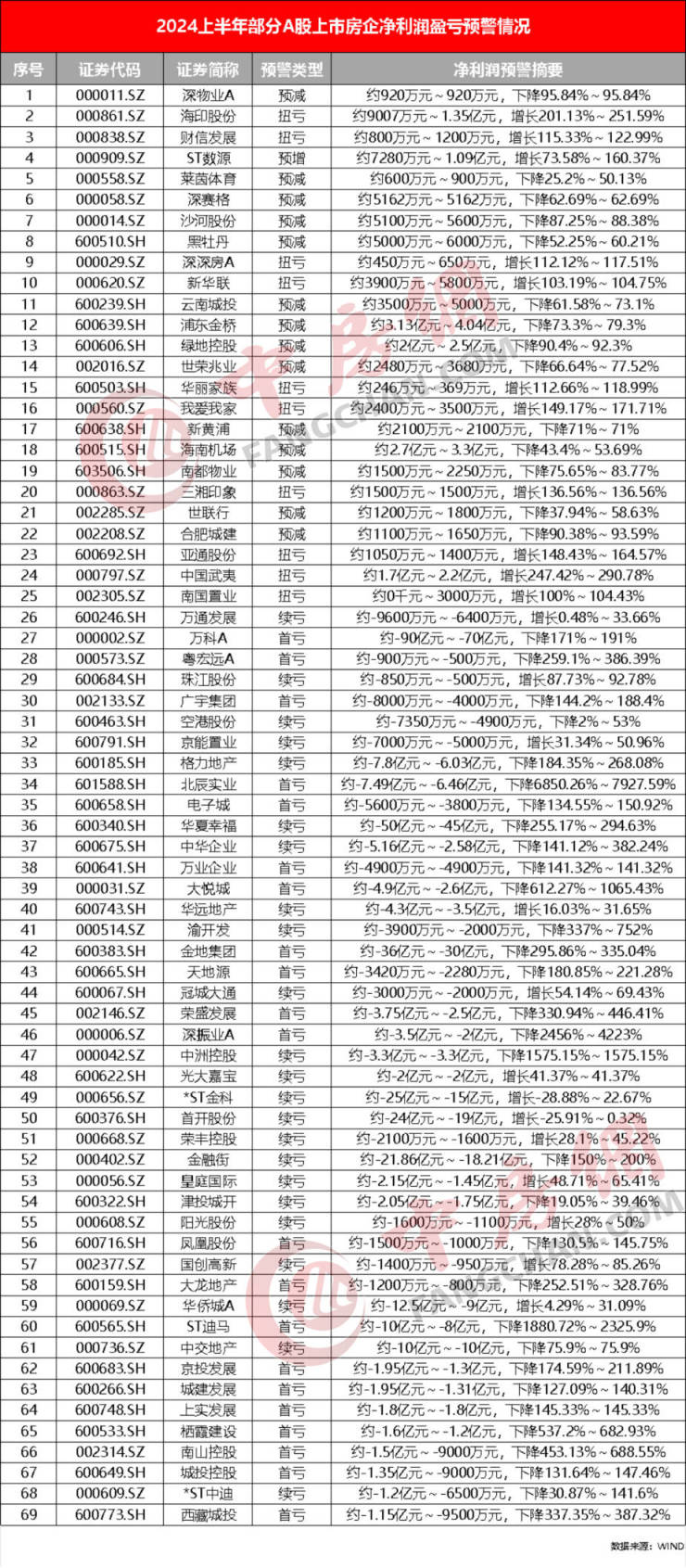 附:2024上半年部分A股上市房企净利润盈亏预警情况