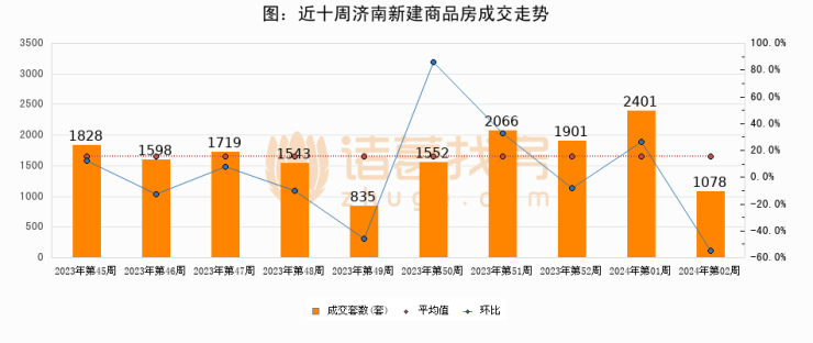 进入2024年第01周(01月01日-01月07日),济南新建商品房成交1078套,较上周减少1323套,环比下降55.1%
