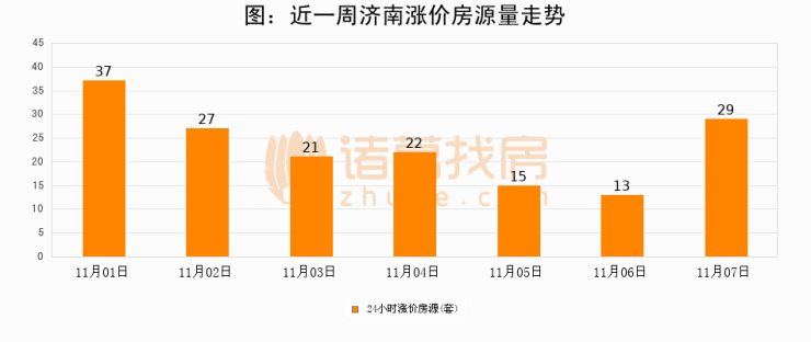 根据诸葛找房数据显示,济南24小时涨价房源量为29套,较11月06日增加16套,环比上涨123.1%。与此同时,涨价房源占比小幅扩大,业主信心有所提升。