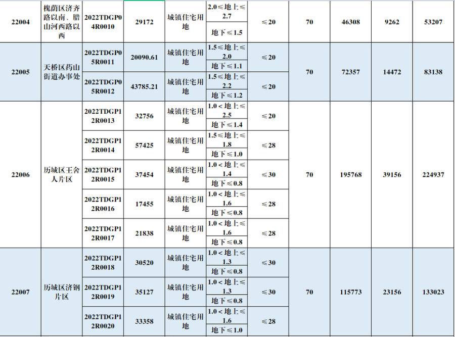 历城区是此次供地主要区域,共有8宗地出让,面积共计约996亩。其中,王舍人片区供应3宗居住用地,由1宗组团住宅地块和2宗单独住宅地块组成,总面积约424.51亩;济钢片区供应5宗组团地块组成,总面积约571.65亩,其中含盖529.056 亩住宅地块和42.59亩商住地块。记者对比此前济南市自然资源和规划局发布的《济南市市辖区 2022 年度住宅用地供应计划宗地表》(以下简称“供地计划”),本次供地中,济钢片区实际供应量比供地计划增加约426.15亩。