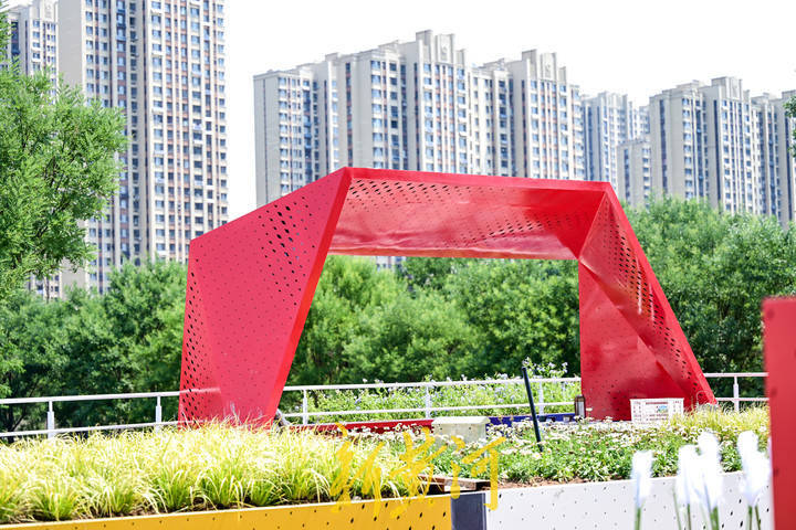 6月20日,在济南西客站片区的腊山河东路与威海路交叉口西北角,这里原是一处小土丘,只栽植了几棵树木和草坪,从今年4月份开始,这里进行综合改造。按照地势分层修建小平台,增加多种颜色的菱形遮阳亭和座椅,安装艺术化…