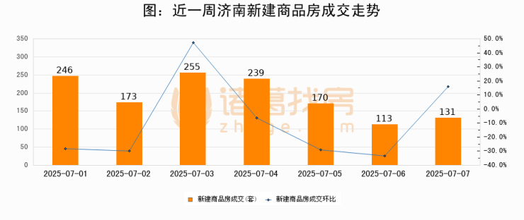 根据济南市住房和城乡建设局数据显示,2025年07月07日济南新建商品房成交131套,较昨日增加18套,环比上涨15.9%