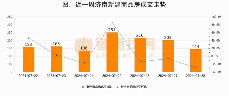 根据济南市住房和城乡建设局数据显示,2024年07月28日济南新建商品房成交144套,较昨日减少59套,环比下降29.1%