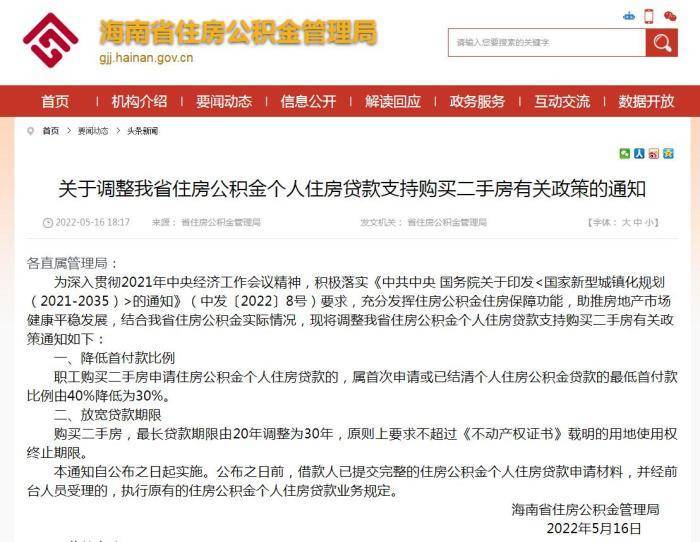 海南调整公积金贷款购买二手房政策:首次申请首付30%