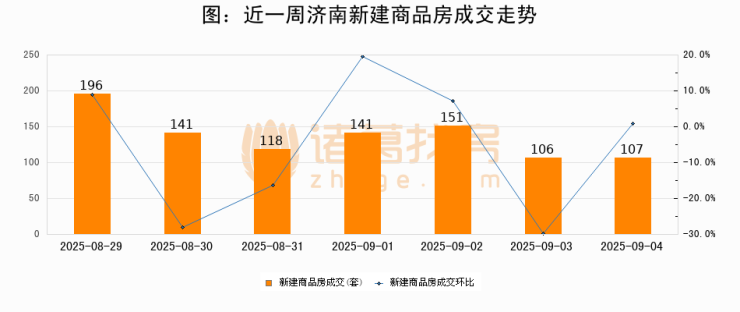 根据济南市住房和城乡建设局数据显示,2025年09月04日济南新建商品房成交107套,较昨日增加1套,环比上涨0.9%