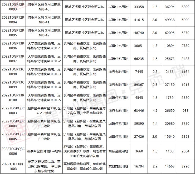 主城区供应的地块中,有住宅用地供应的区域仅有白马山、大庙屯、西沙、济钢和长清、起步区等区域。其中济钢推出的5个地块与预公告时的楼面价保持一致,意味着济钢5宗地已经有了托底方。