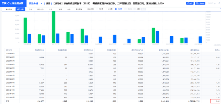 所推出住宅地块中,西沙地块地价降幅较大,主要是由供求导致的,根据克而瑞山东投资决策系统的地块一键报告数据,近13个月内,地块周边3km内商品住宅供求比为1.23,供应明显大于需求。