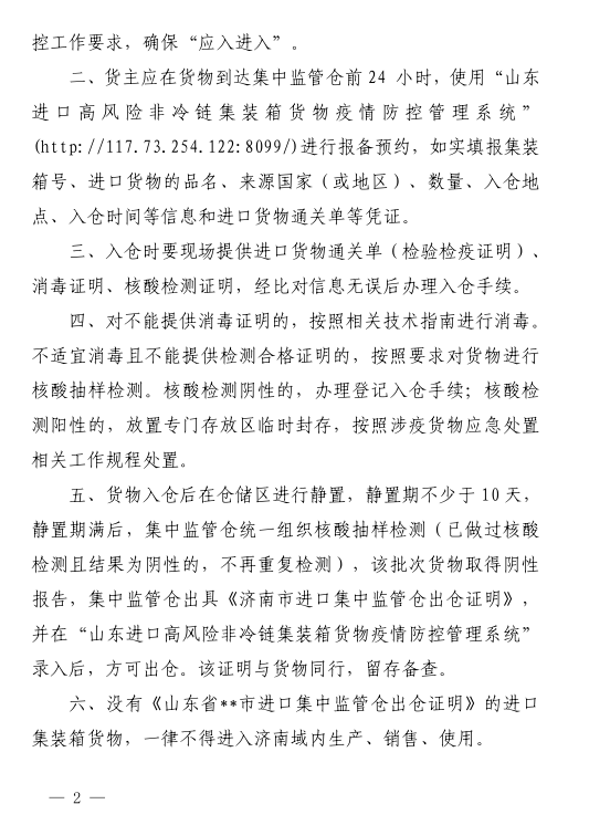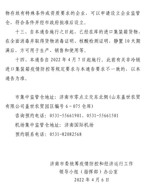 4月6日,济南市委统筹疫情防控和经济运行工作领导小组(指挥部)办公室发布《关于济南市启用进口高风险非冷链集装箱货物集中监管仓的通告》,济南市启用进口高风险非冷链集装箱货物集中监管仓。