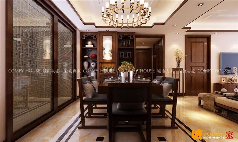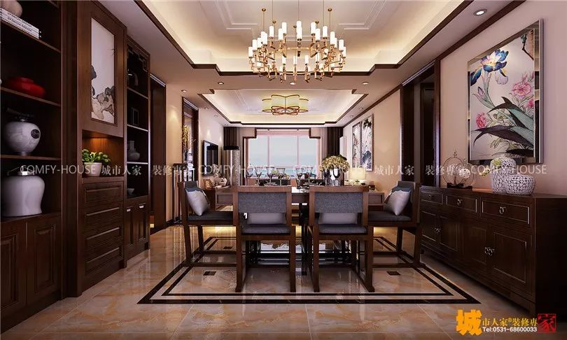 考虑到原户型客餐厅处于一个对角形式,从视觉感受上比较不舒服,在吊顶上给客户做了取方的设计改造,在吊顶设计时以青花八宝吉祥瓶为设计文化载体,吊顶四个小对角的八个面预示着佛家八宝,具有化煞镇宅吉祥之用。