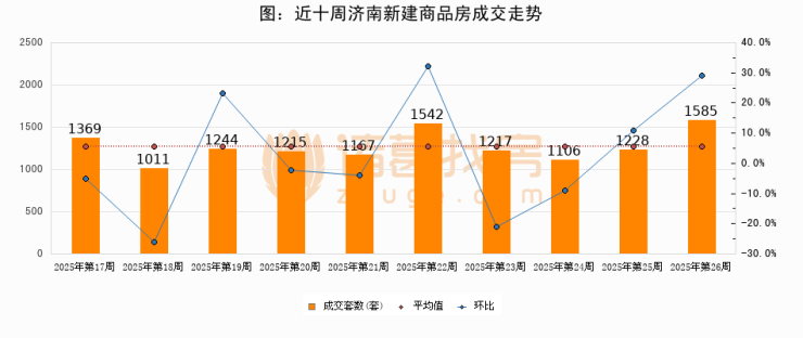 进入2025年第26周(06月23日-06月29日),济南新建商品房成交1585套,较上周增加357套,环比上涨29.1%