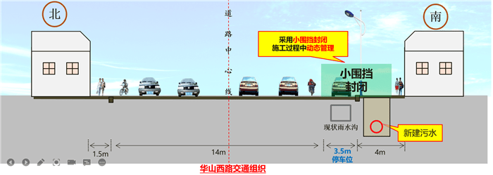 华山西路南北两侧分幅施工,先施工南侧,后施工北侧,道路封闭采用小型钢制围挡,夜间施工需封闭一幅快车道及慢车道,日间封闭单侧慢车道。