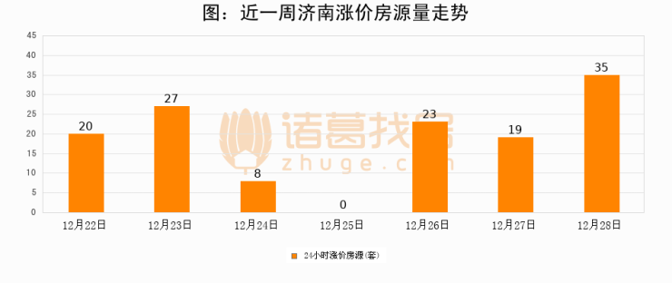 根据诸葛找房数据显示,济南24小时涨价房源量为35套,较12月27日增加16套,环比上涨84.2%。与此同时,涨价房源占比小幅扩大,业主信心有所提升。