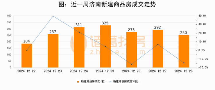 根据济南市住房和城乡建设局数据显示,2024年12月28日济南新建商品房成交250套,较昨日减少42套,环比下降14.4%