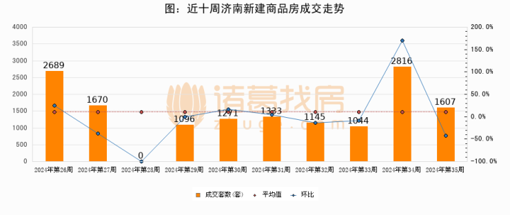 进入2024年第35周(08月26日-09月01日),济南新建商品房成交1607套,较上周减少1209套,环比下降42.9%。从近十周成交来看,周均成交套数为1467套,本周成交1607套,高于近十周平均成交量9.5%。