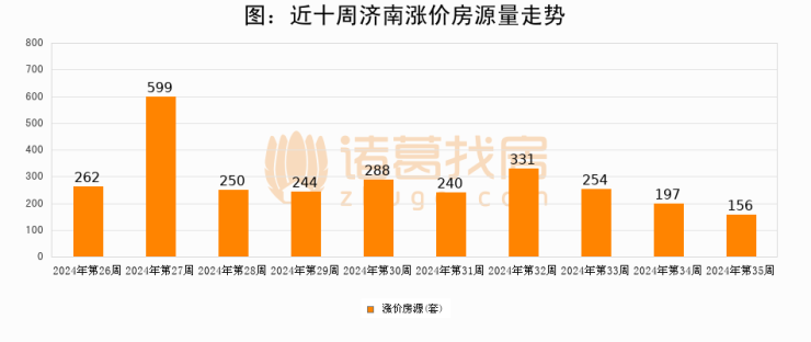 从调价房源来看,第35周济南涨价房源156套,较上周下降20.8%。与此同时,35周涨价房源占比回落0.26个百分点,业主信心小幅波动,购房者可则需入市。
