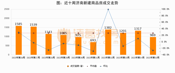进入2025年第35周(08月25日-08月31日),济南新建商品房成交969套,较上周减少348套,环比下降26.4%