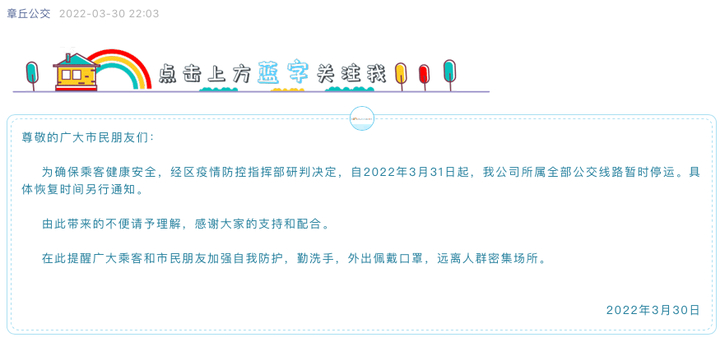 为确保乘客健康安全,经区疫情防控指挥部研判决定,自2022年3月31日起,我公司所属全部公交线路暂时停运。具体恢复时间另行通知。
