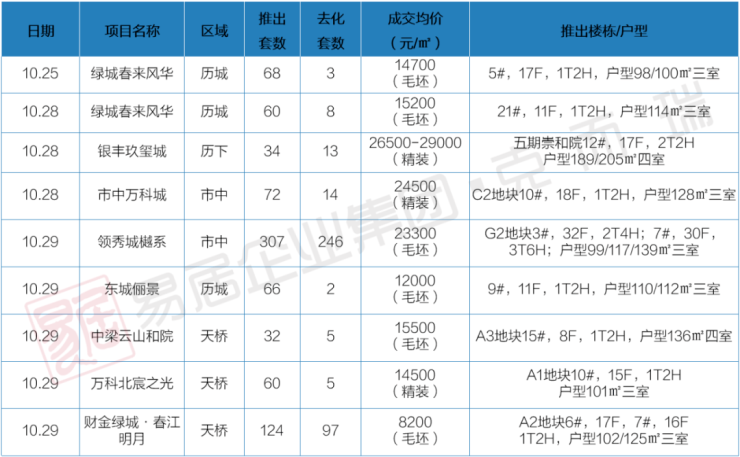 10月24日-10月30日,济南共有8个项目开盘,推出823套房源,去化393套,总体去化率约48%。