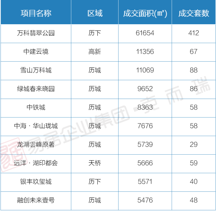 10月24日-10月30日,济南商品住宅签约面积TOP10,万科翡翠公园、中建云境分别位于榜单的排名前列、第二名。
