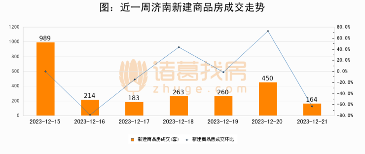 根据济南市住房和城乡建设局数据显示,2023年12月21日济南新建商品房成交164套,较昨日减少286套,环比下降63.6%