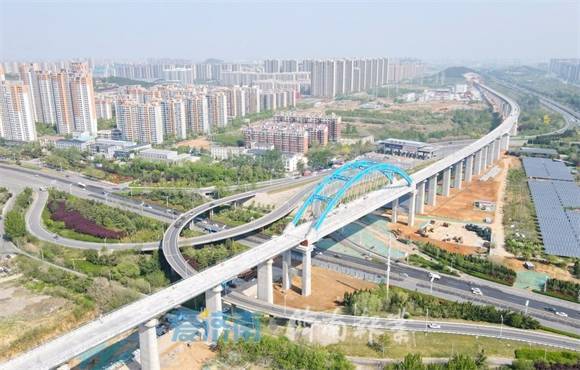 在济莱高铁跨邢村立交段俯瞰,高架箱梁如长龙般横亘在高速路一侧,气势磅礴。近日,济莱高铁最后一榀箱梁在济南东制梁场顺利浇筑。至此,全线箱梁预制任务优质收官,架梁施工在紧锣密鼓“前进”。据了解,济莱高铁是全国首条设计时速350公里的市域内高铁,是山东省会城市群经济圈建设的重大基础设施项目,线路全长117.49公里,是济南“米”字型高铁网的重要组成部分,建成后有助于山东省内两小时交通圈的建设,也有利于加强山东省会城市群经济圈与京津冀、长三角等地区的互联互通,促进区域融合发展。
