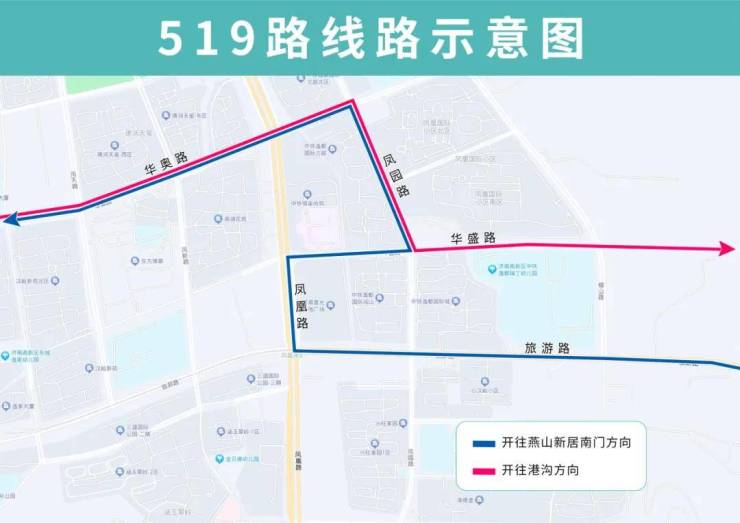 519路临时调整后开往燕山新居南门方向沿旅游路向西、凤凰路向北、华盛路向东至凤园路向北恢复原线,临时增设小汉峪(路北)站点,临时撤销凤园路旅游路(路东)站点;开往港沟方向线路不变。