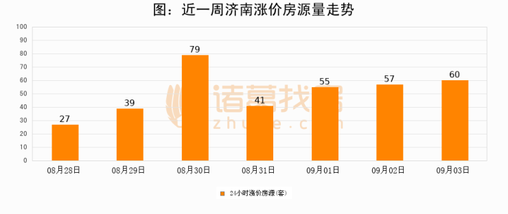 根据诸葛找房数据显示,济南24小时涨价房源量为60套,较09月02日增加3套,环比上涨5.3%。与此同时,涨价房源占比小幅扩大,业主信心有所提升。