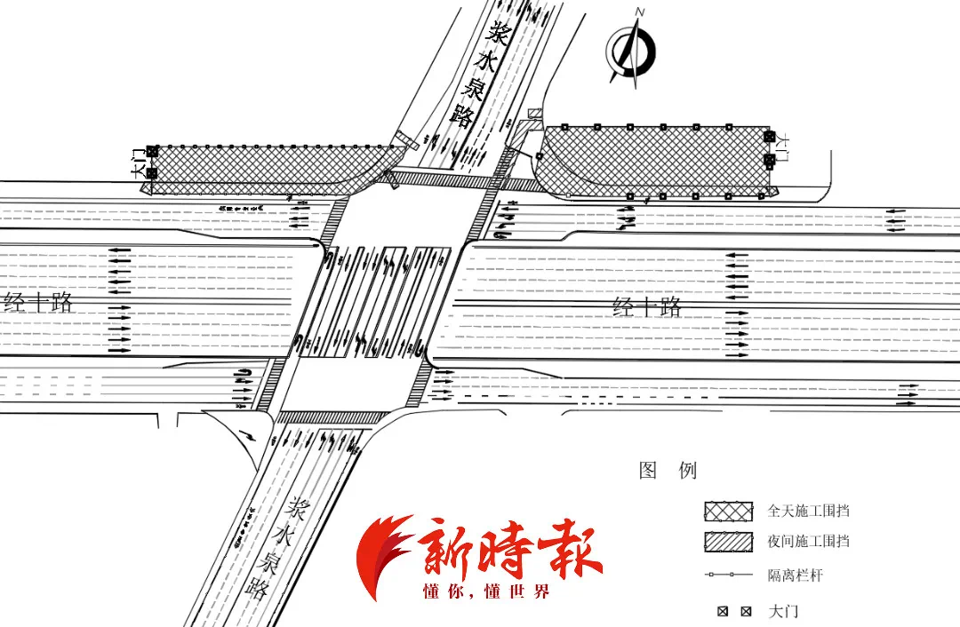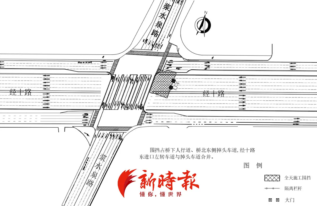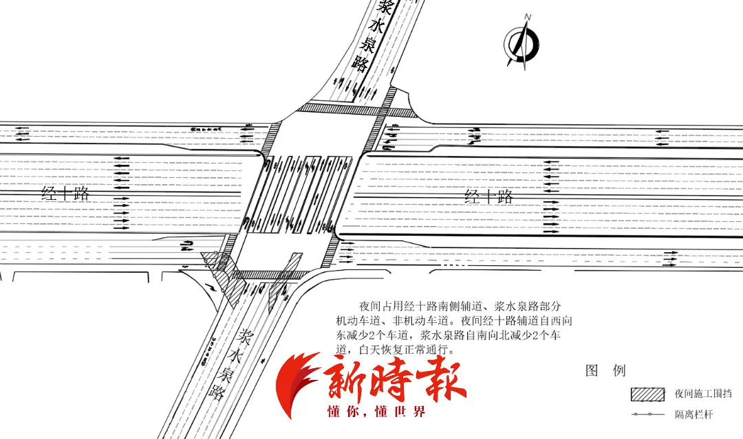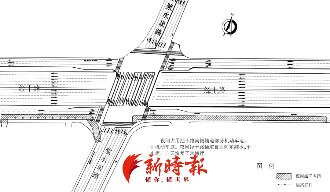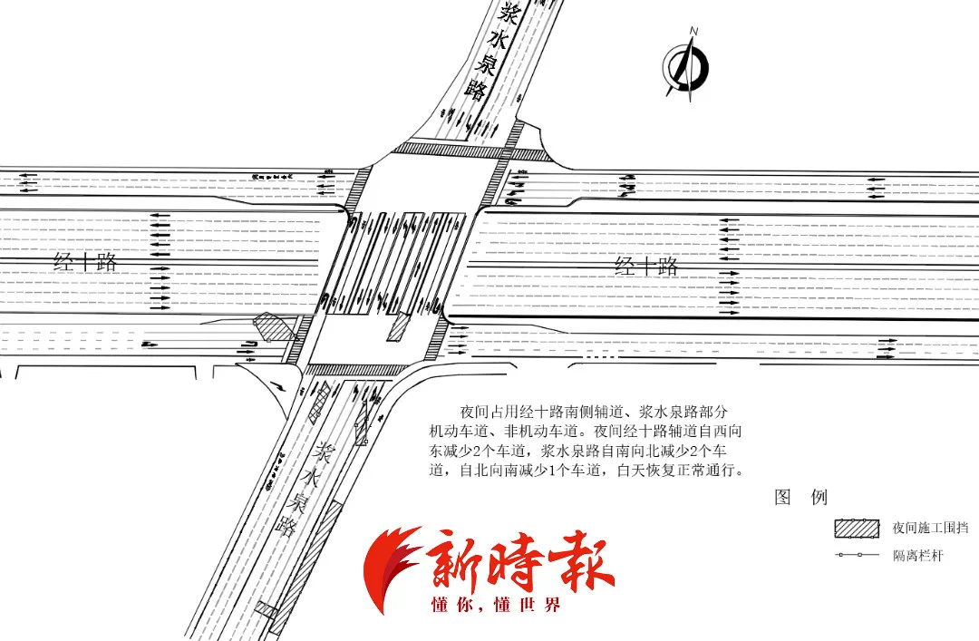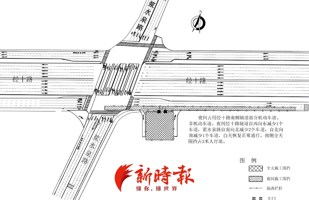 自2021年4月21日起至2026年6月20日,分7期对经十路(浆水泉路路口)部分车道进行围挡施工。夜间施工期间经十路辅路自西向东方向机动车道由3车道变为2车道,行人及非机动车两侧通行,其他车道通行方式不变。