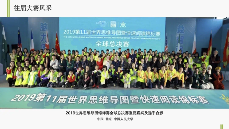 世界思维导图暨快速阅读锦标赛是脑力运动奥林匹克大赛其中的一项,排名前列届的举办地点在伦敦。由世界脑力运动理事会组织的全球高水平的大脑思维竞技赛事,被誉为“脑力运动的奥林匹克”!