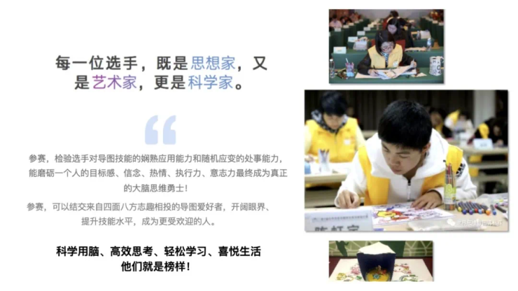 3、经大赛组委会正式授权的城市赛承办机构和指定选手训练机构均在大赛少有官网公布。选手在其他冒用“世界思维导图锦标赛暨快速阅读锦标赛”名义的机构报名、培训、比赛,组委会均不承担责任,比赛成绩不予认可。