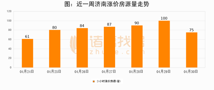 根据诸葛找房数据显示,济南24小时涨价房源量为75套,较04月29日减少25套,环比下降25%。与此同时,涨价房源占比小幅回落,对于购房者来说是一个入市窗口期,购房者可抓住时机入市。