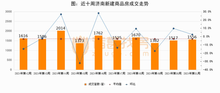 进入2024年第52周(12月23日-12月29日),济南新建商品房成交1556套,较上周增加39套,环比上涨2.6%