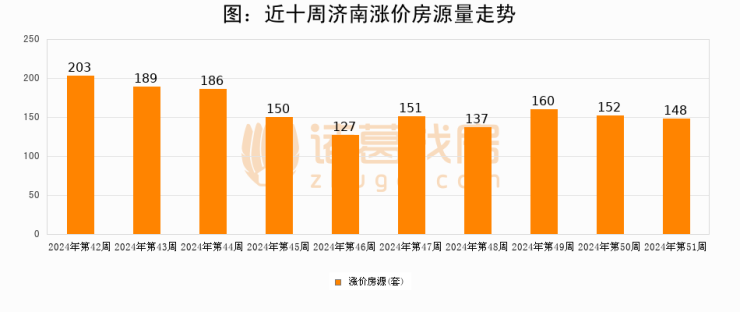 从调价房源来看,第52周济南涨价房源148套,较上周下降2.6%。与此同时,52周涨价房源占比回落0.25个百分点,业主信心小幅波动,购房者可则需入市。