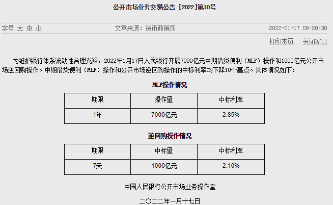 央行1月17日公告称,为维护银行体系流动性合理充裕,1月17日开展7000亿元1年期中期借贷便利MLF操作和1000亿元7天期公开市场逆回购操作,中标利率分别为2.85%、2.10%,中标利率均下降10个基点。