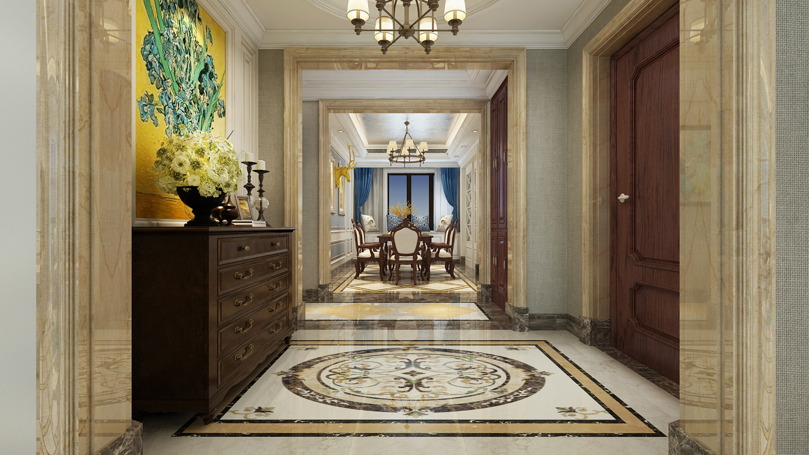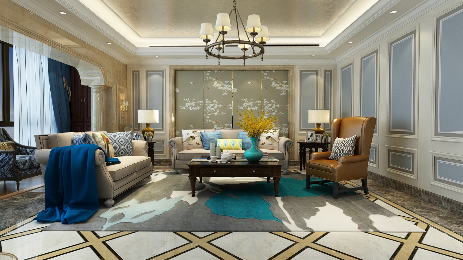 在整个设计中不少看似简单的细节在仔细观摩后才会发现原来还有着如此多的讲究。墙纸虽然并非浓墨重彩但其中的写意花鸟镶嵌在木质的白色墙壁中让整个空间都变得诗情画意,同时也使旁边布艺的沙发与纯色的背不再显得那么单调。在家具上,内敛古典的棕色扶手椅搭配上米色系的沙发,再添上旁边精致的台灯,使得本应看上去有些沉闷的整体也散发出朝气与活力,让整个客厅都显得成熟大方且又古典雅致。在整个陈设的选择上设计师非常考究,只选对的不选贵的,在选择时非常的注重质量和质感,造就这个美式轻奢风。整个设计中还有大量的雕刻暗藏其中,使得整个设计更加有着古典的韵味却又没有剥离舒适感,在保留了古典家具的色泽和质感的同时,又变得更加适应现代生活的节奏。